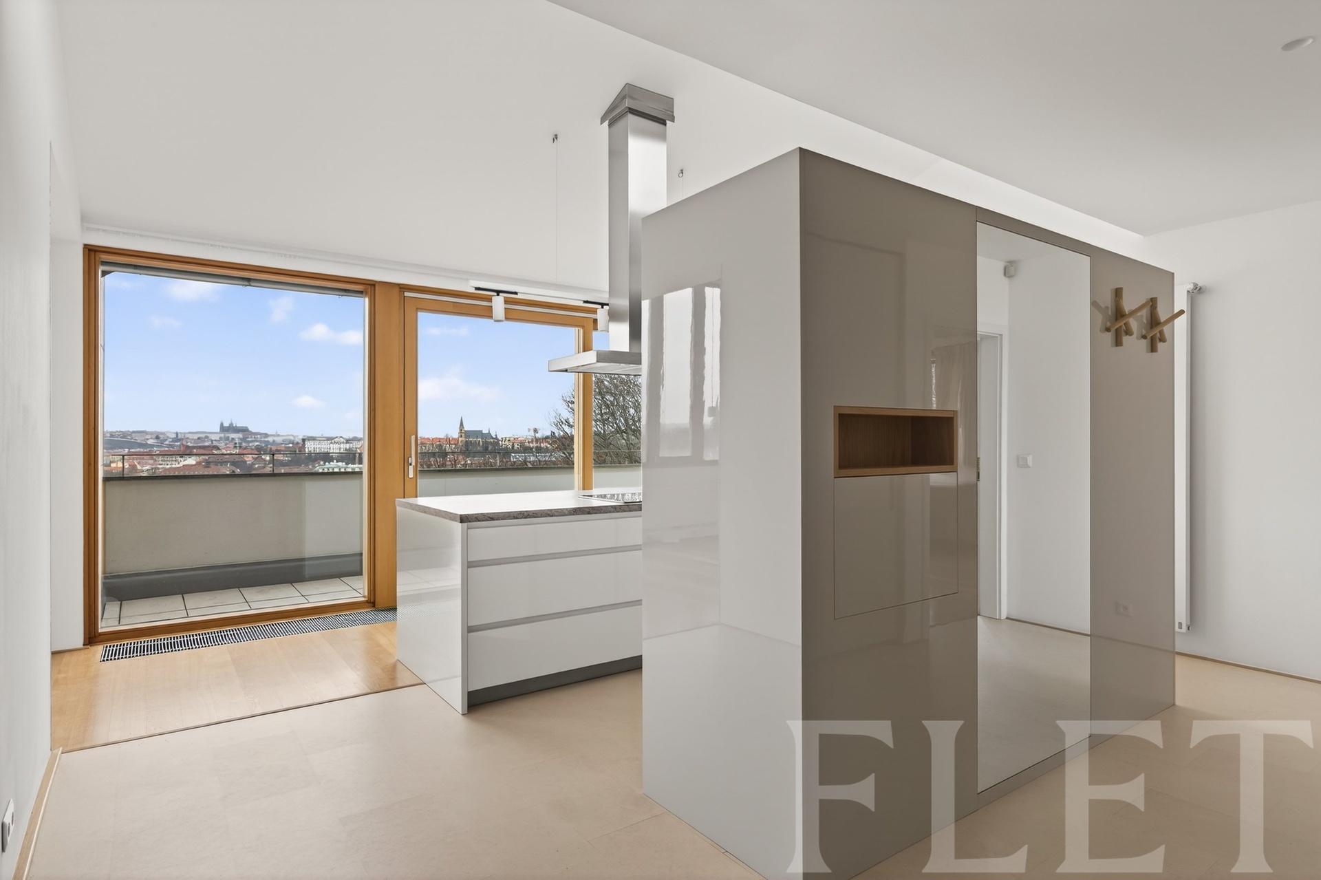 Jedním z hlavních benefitů jsou dva rozměrné balkóny s dechberoucím výhledem na celou Prahu. Nabízejí ideální místo pro ranní kávu, večerní posezení i klidný odpočinek s výhledem na panorama města. Díky orientaci bytu je interiér prosvětlený po celý den a působí mimořádně příjemným, otevřeným dojmem.
