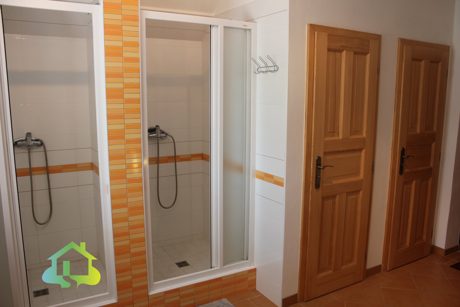 Přízemí Vás přivítá útulným obývacím pokojem (19 m²) a plně vybavenou kuchyní (17 m²) se sporákem, mikrovlnnou troubou. Srdcem této části je však velkorysá společenská místnost o rozloze 63 m² – ideální prostor pro rodinné oslavy, setkání s přáteli nebo prostě jen pro zábavu. K dispozici je zde kulečníkový i pingpongový stůl. Přímo ze společenské místnosti se otevírá cesta na zahradu. V prvním patře se nachází tři prostorné pokoje (23, 34 a 31 m²), všechny částečně zařízené nábytkem, a koupelna se dvěma sprchovými kouty a dvěma WC.