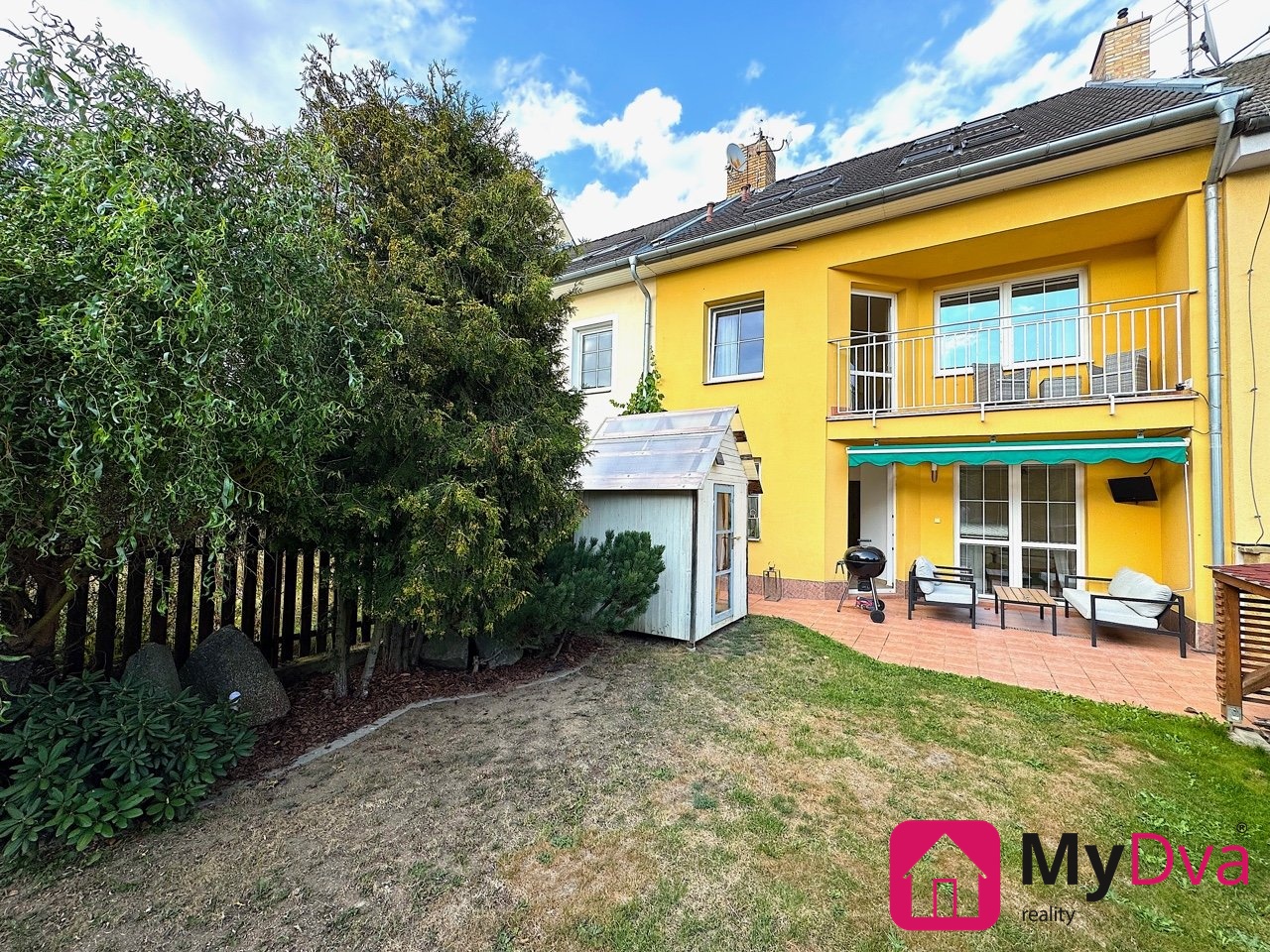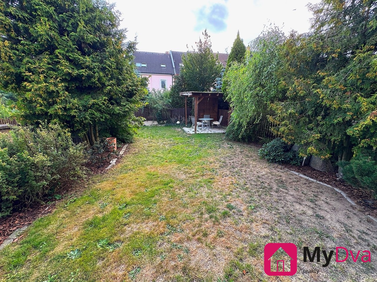 Za domem najdete udržovanou zahradu o ploše 124 m² s terasou, markýzou a zahradním domkem na nářadí – ideální prostor pro relax i rodinné grilování. Před domem jsou dvě parkovací stání. Dům se pronajímá bez garáže.